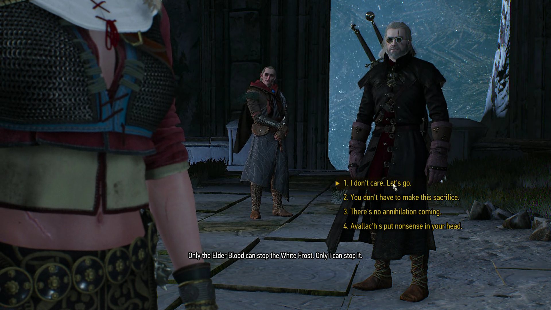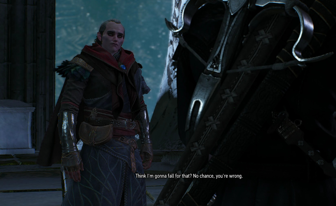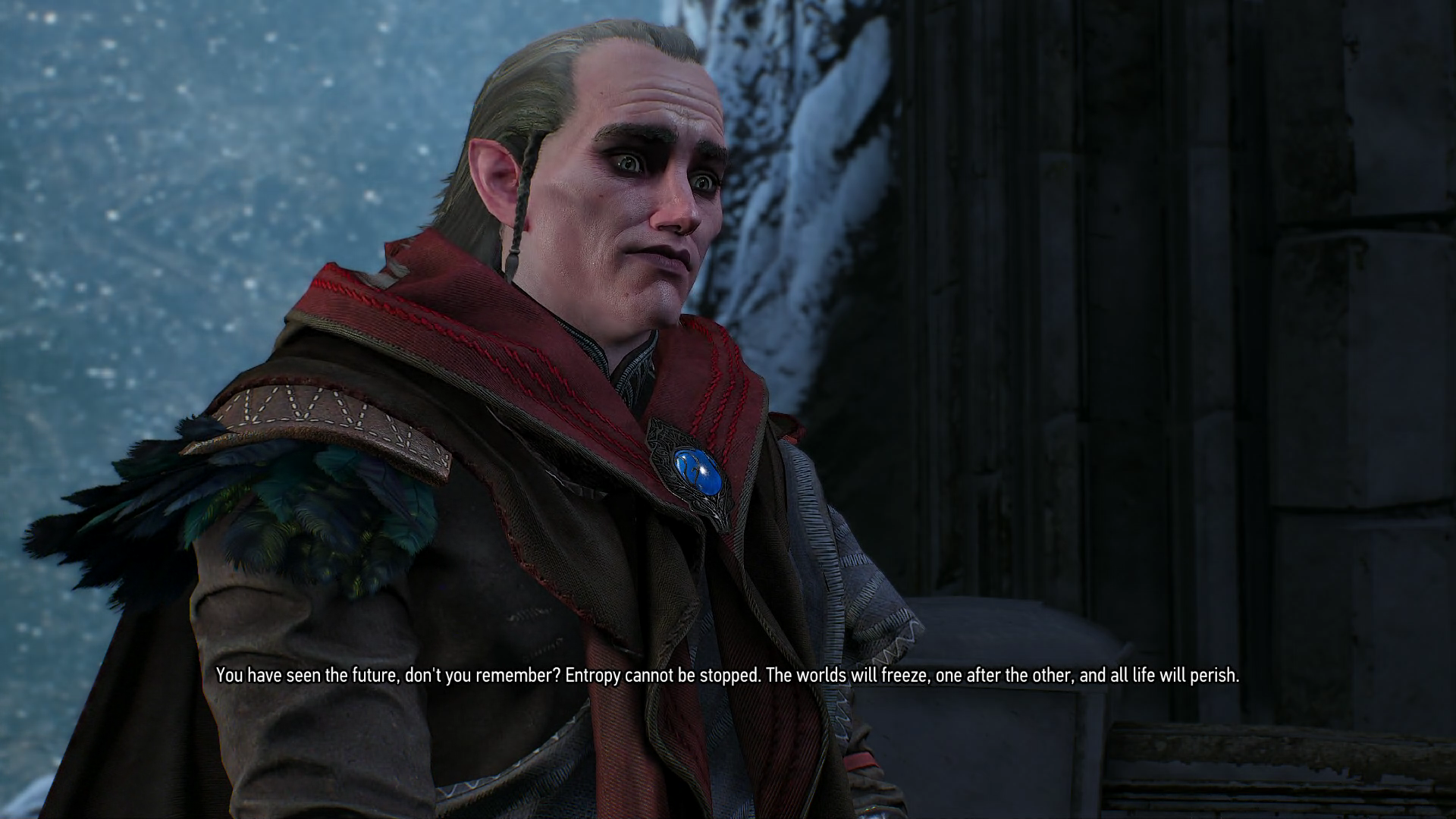 Avallac'h looks crazier then normal here... and most people will never see this very rare cutscene, where Avallac'h actually tries to stop Ciri from going into the tower... Starting with the timed option here at the tower, you must select every quest answer in a specific sequence to trigger this rare cutscene.