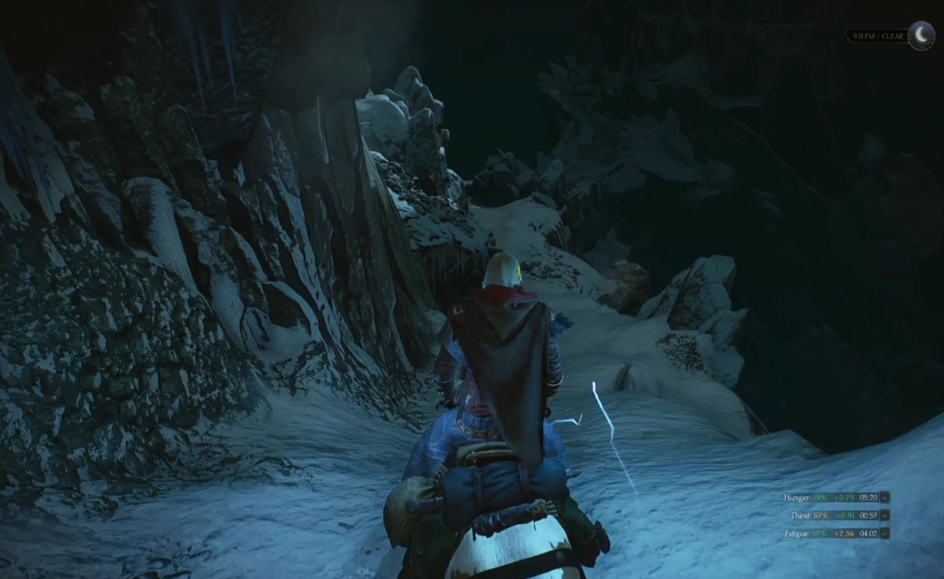 You do not need to go all the way to the bottom. You want to inch your way steadily to your right hand side... until you see a ledge about half way down... the Ice Trolls patrol here, so you will see them coming in and out of the cave periodically. They never leave the ledge, so you are safe until you reach the ledge. Once you see the ledge, stop climbing towards the bottom... look below you. Save. Once you reach this point, you don't want to die and end up back at the top. Save so you can respawn here if you die here. There is a narrow ridge, the top edge of a crag. Jump down and land on it. It may take a few tries. It is VERY difficult to land on the exact spot. If you miss, you'll die.