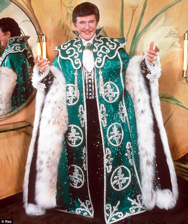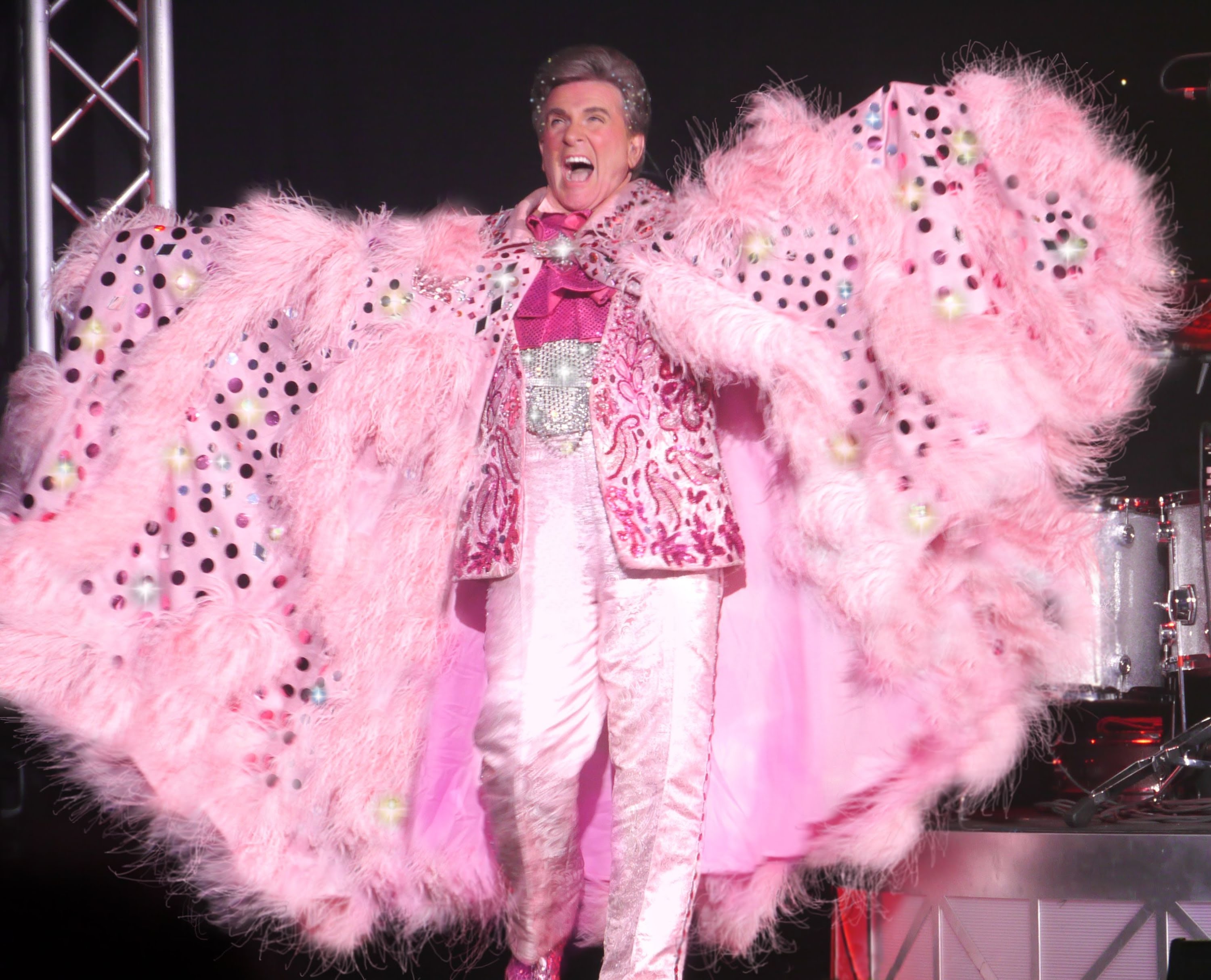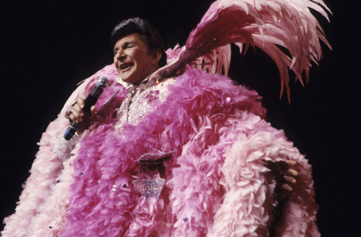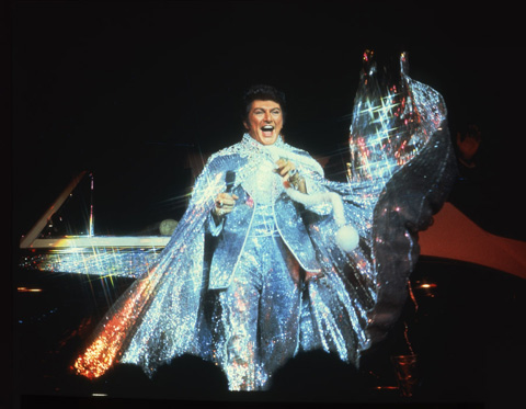 Liberace at 68 years old, during his final performance, a few weeks before his death... wearing his infamous "pink peacock" cape.