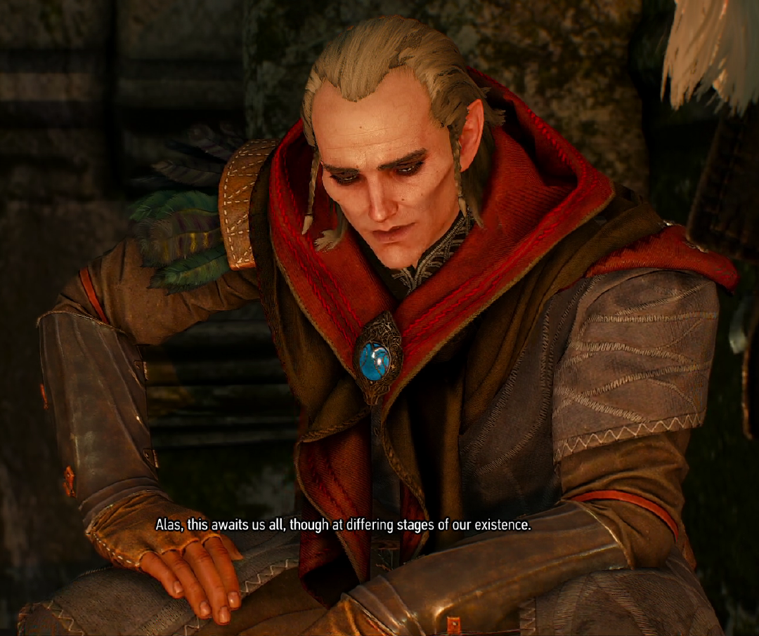 Avallac'h is a hot tempered, little spitfire of an Elf. Tread softly with him and never turn your back on him. The Aen Elle tell stories of Crevan, stories which say he has personally killed thousands of Humans - outside of war, unprovoked, for no reason at all other then they were Humans and he was there. And when Geralt questions him about this, asking Avallac'h directly if he ever fells any guilt when murdering Humans, Avallac'h responds to say... "Do you Humans feel guilt when you murder Aen Sidhe Elves? Or Dwarves? Or Dryads?"