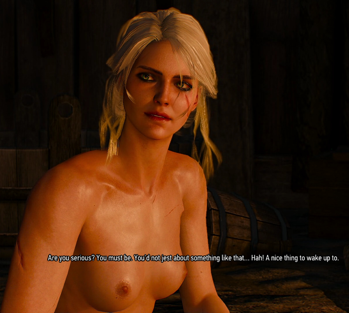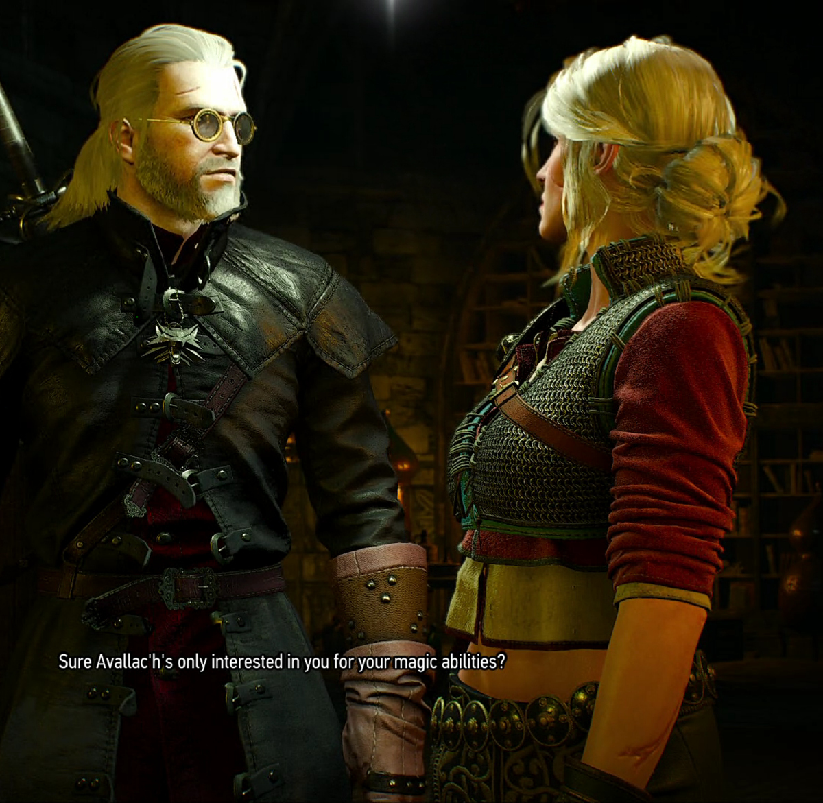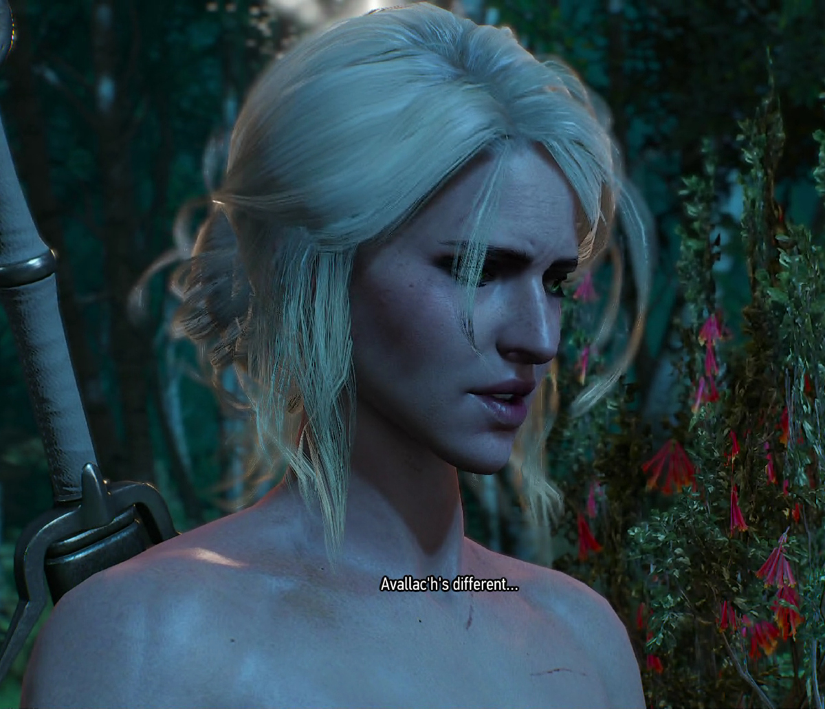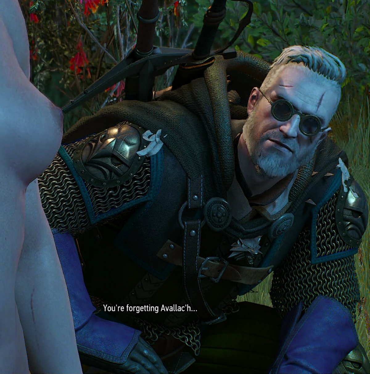 Special edition version, with nudity settings on: Avallac'h with Corinne Tilly Ciri, Triss, Yennefer, and Geralt, with Avallac'h on board Avallac'h's ship. Avallac'h at Vesemir's funeral with Geralt, Triss, Eskel, and Yennefer Avallac'h and Ciri arguing at Kaer Morhen |