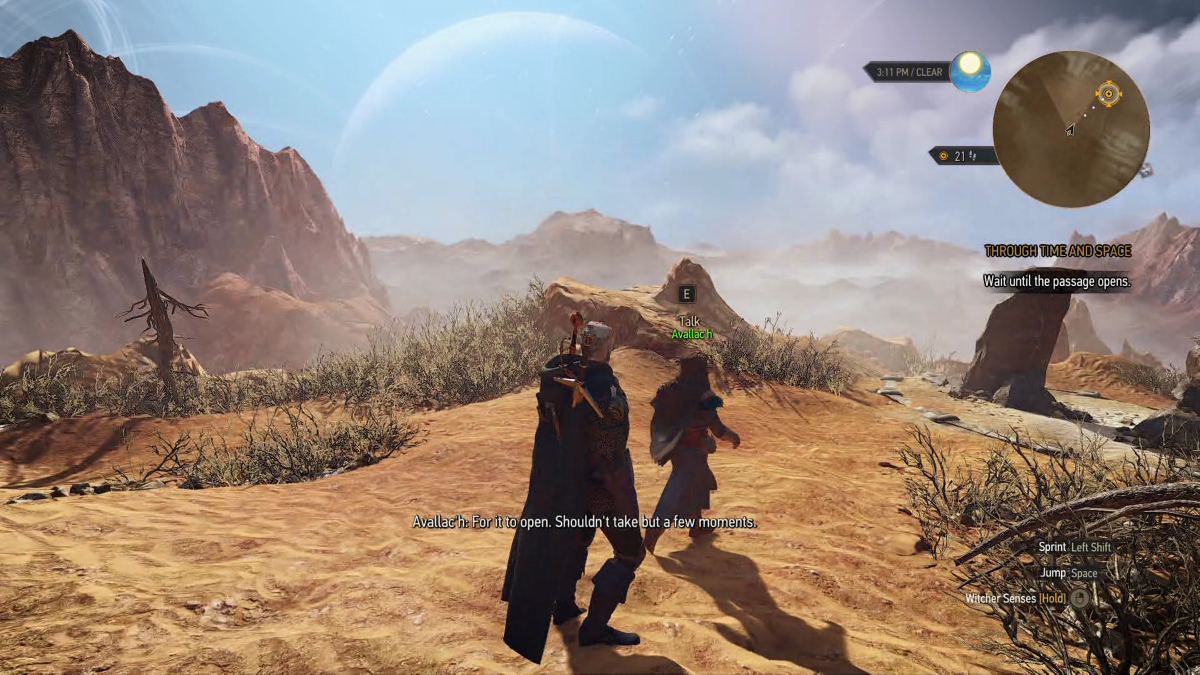 If you are not familiar with the game, let me point out here that Avallac'h is a NPC (non player character) meaning I have no ability to control his actions. Even when travel companions spawned in, Geralt is still the ONLY character you as a player can control. All other characters are still controlled by the computer and do whatever it is the developers programed them to do. Thus Avallac'h is controlled by the computer AI of the game. What you are seeing him do here ... that's the computer controlling him as if another player just jumped into the game and took control of his character.