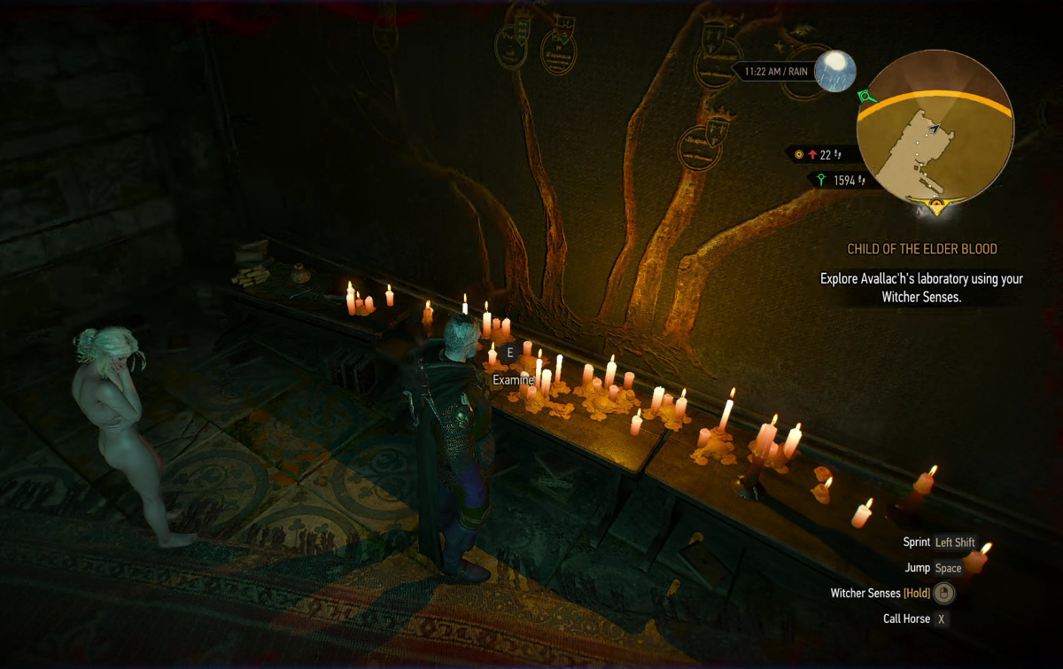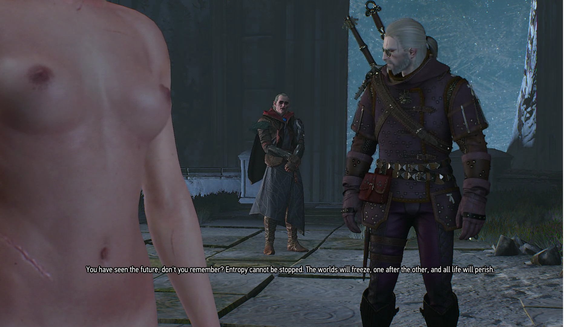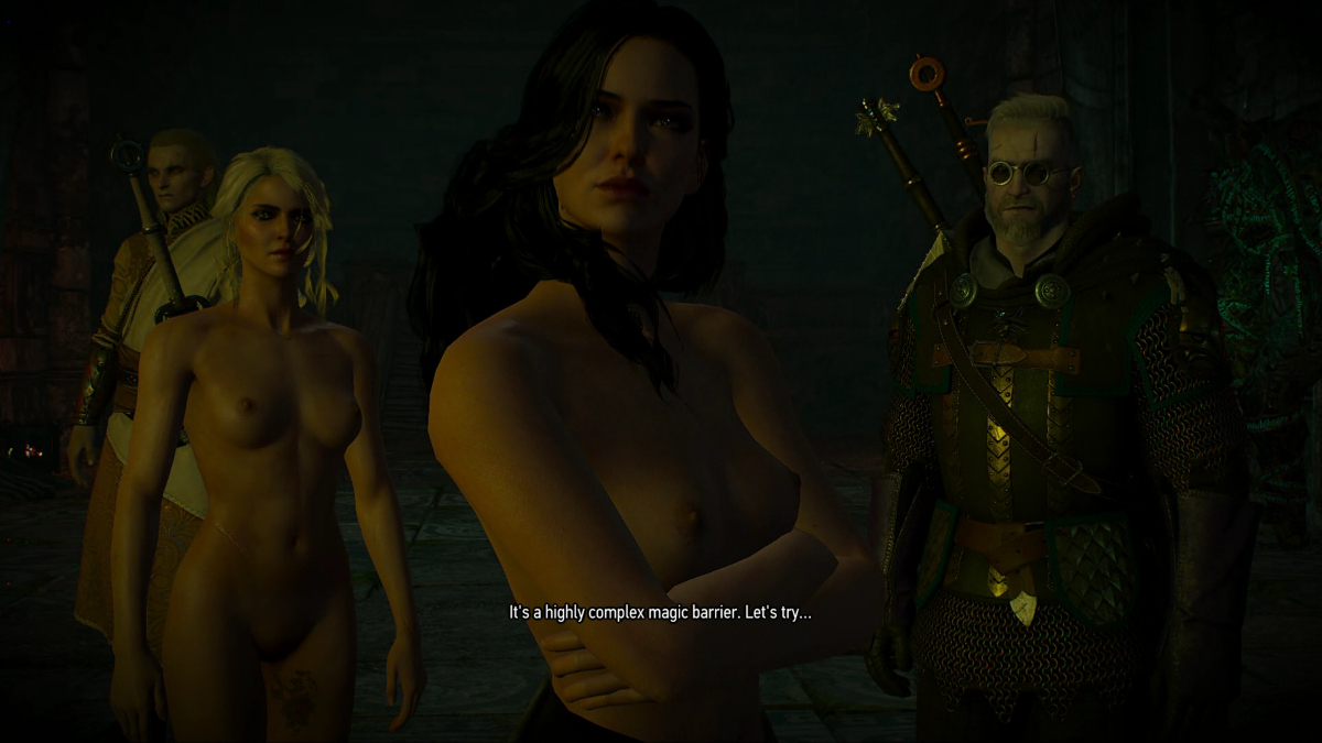 What the game looks like with travel companions AND nudity settings turned on (note with the nudity setting on, Avallac'h is the ONLY male character who loses his clothes, and only certain females lose their clothes, with a higher rate of nude females in the area if you have Avallac'h with you, then if you travel without him.)