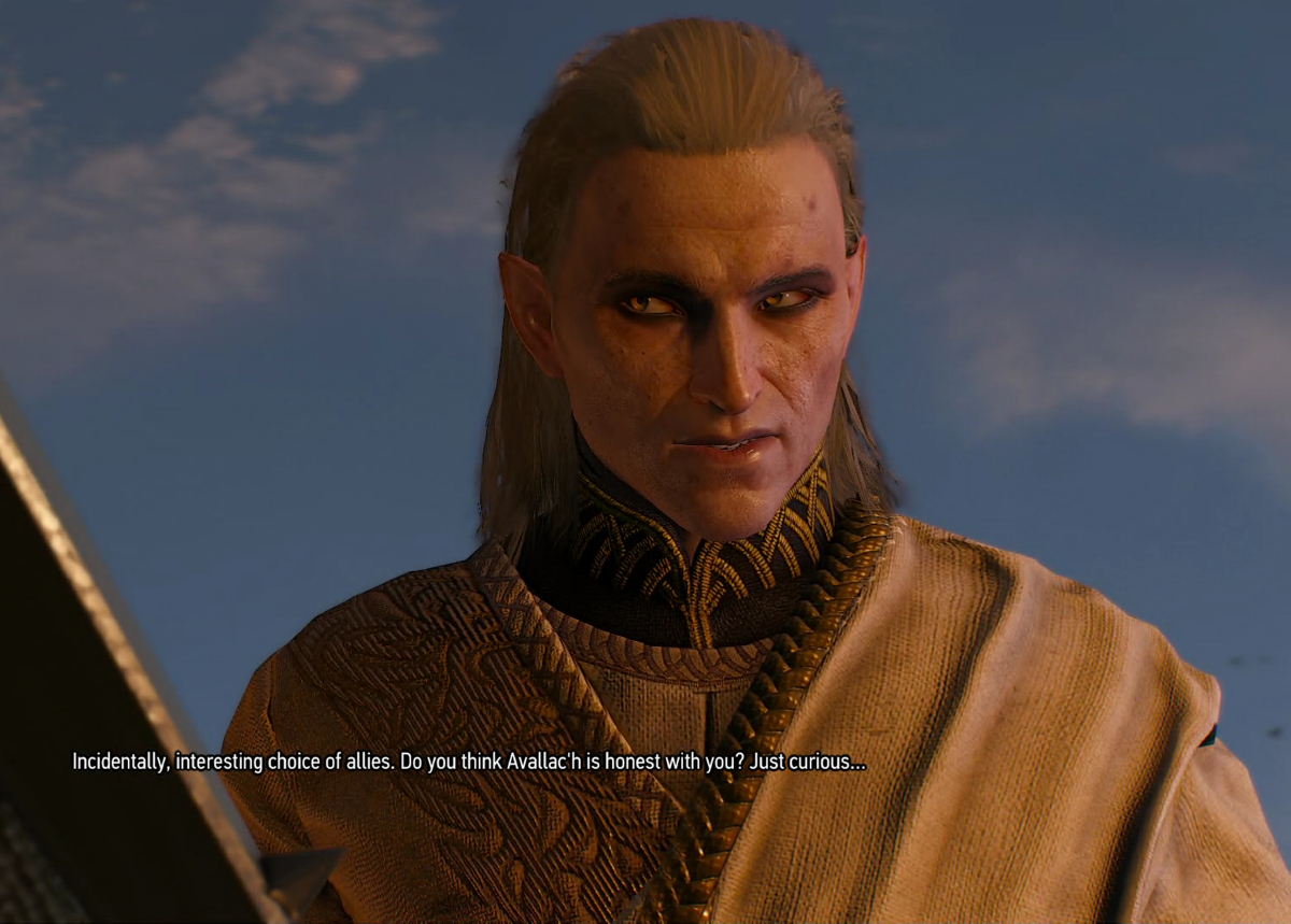 After reading all the novels and playing the entire 612 hour game multiple times, I can safely say Avallac'h is the only character to fling feces on Geralt, vomit on Yennefer, rape Ciri, strip Corinne Tilly naked while psychically fucking her brain, destroy ancient cave paintings by graffiti-painting giant penises on them, and then run wildly through a field unicorns playing panpipes while herds of naked women wearing nothing but gold glitter body paint are running along after him like he's the damned Piped Piper... then leaves their corpses in the boneyard behind his house... and he doesn't give a rat's ass what anybody thinks of him while he does any of it.