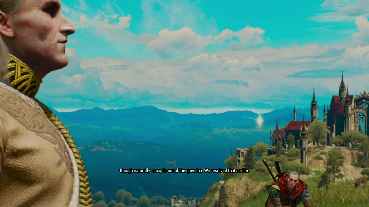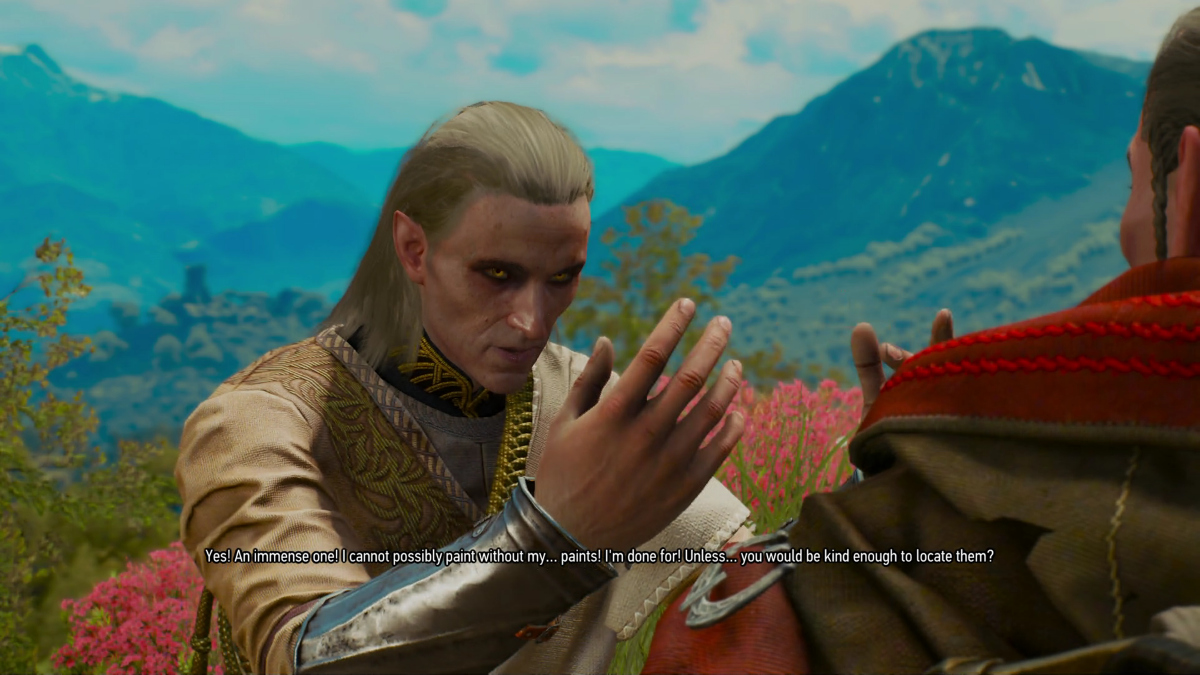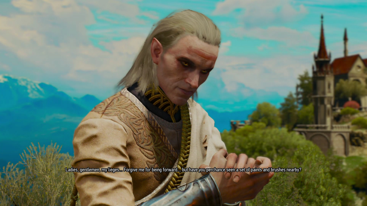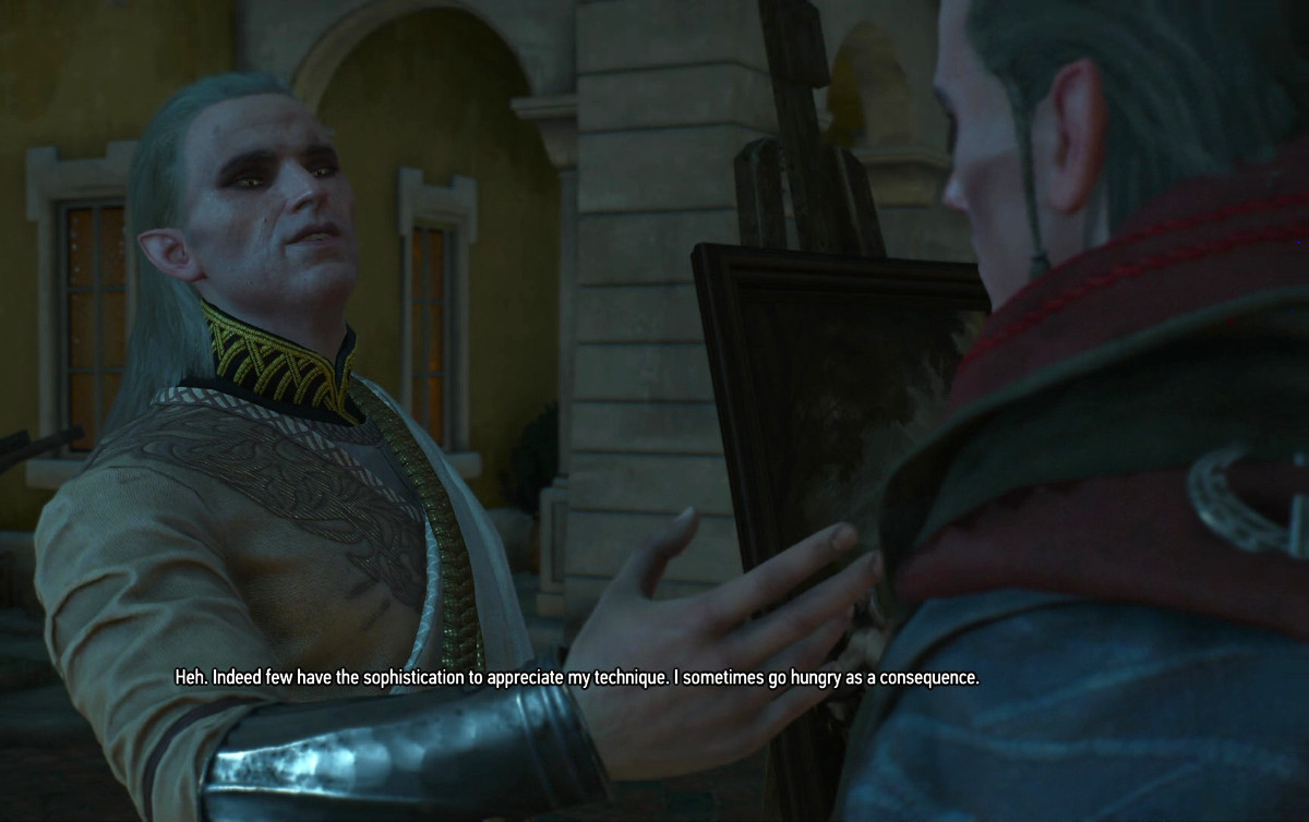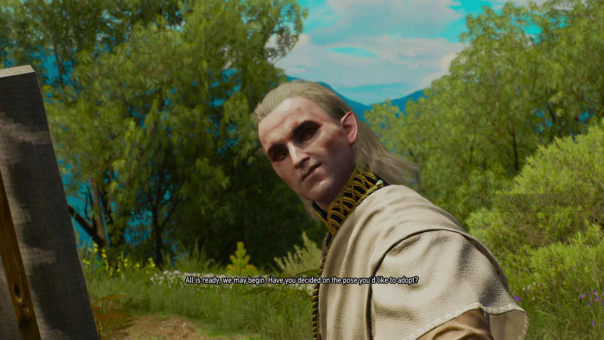 Avallac'h annoying Ge'els, as always...Ge'els attempting to paint Avallac'h's portrait. Ge'els is trying to get Avallac'h to stand up and pose, while Avallac'h declares he's bored and going to lay down to take a nap, so Ge'els will just have to paint a picture of him sleeping.This is also my 4th time through the game... we have to play it 14 times (200+ hours each time - though I speed ran my 2nd time and we did it in just 70 hours - how the hell do you speed run Witcher 3, I don't know, but I did it) to get all 14 endings... so we are not even close to being done playing this...and yes, as soon as I figure how to do so, we are going to bring Ge'els into gameplay and play as him too. I have so much fun hacking this game. Now that I've finished the cannon run of it we can fanfic the hell out all the rest of my playthroughs... but you want cannon stuff for this page, so off the cannon run: