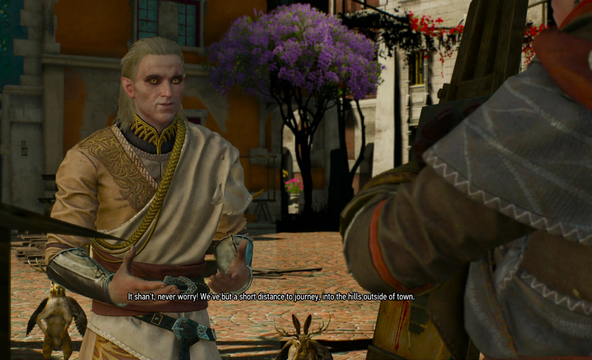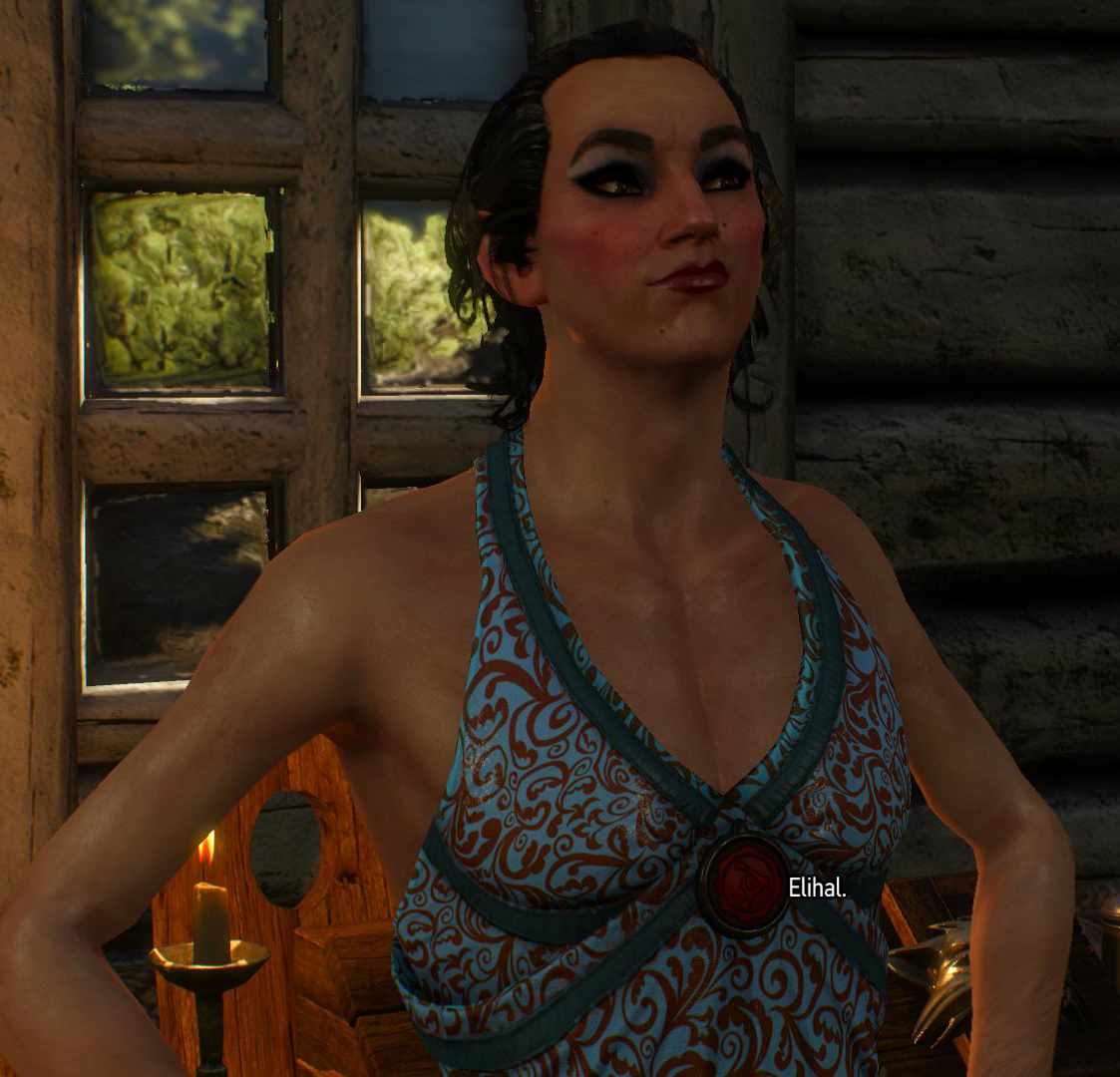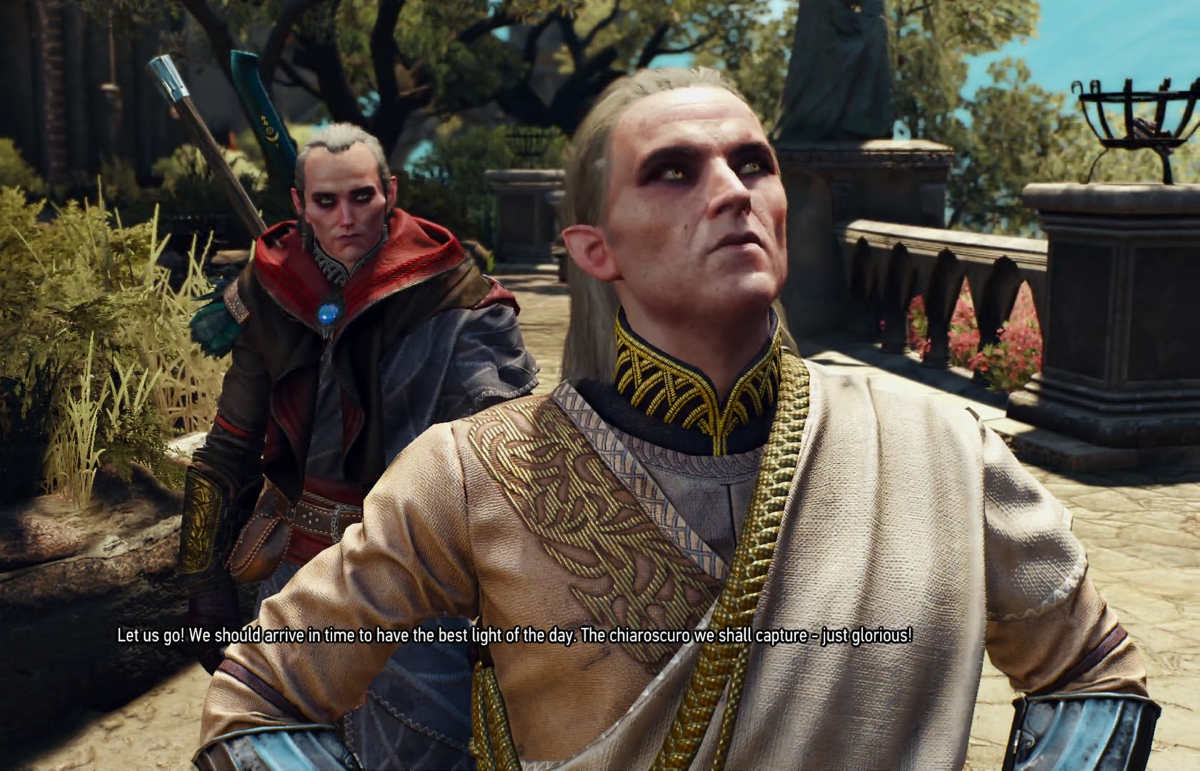 Avallac'h to Geralt: "Do you Humans feel guilt when you murder Aen Sidhe Elves? Or Dwarves? Or Dryads?"And with that said... seeing how Avallac'h and Ge'els are my two fave characters, I've turned on travel companions in my playthrough, spawned them both in, along with Avallac'h's wife Isilira and Ge'els' girlfriend Tulip, who are seen with Geralt in the previous picture. The images seen on this page, therefore show Avallac'h and Ge'els in scenes that you WILL NOT see them in, if you are playing the game on Xbox or PS4.