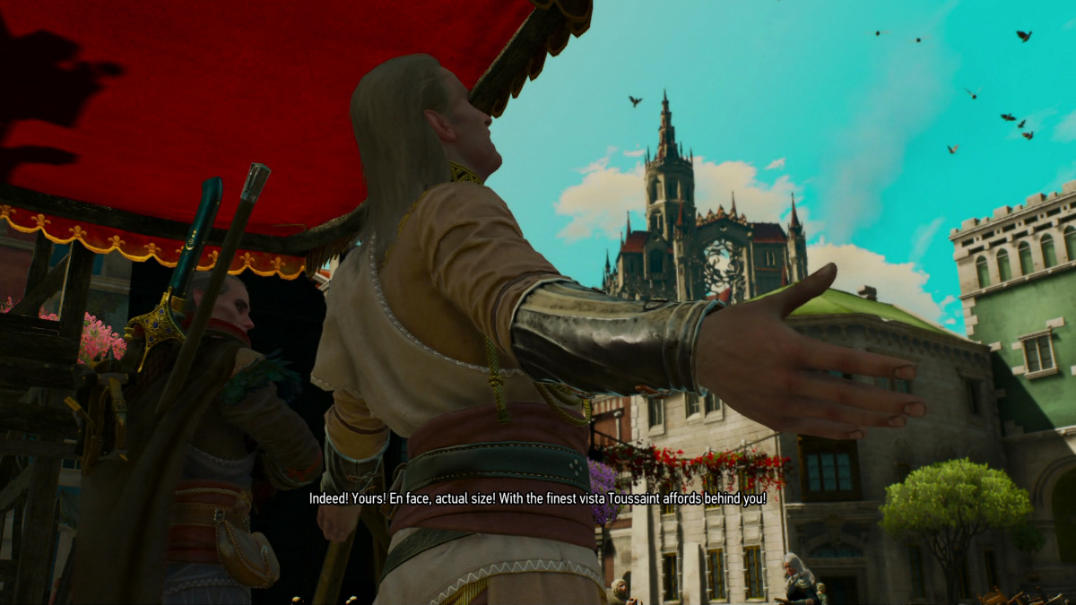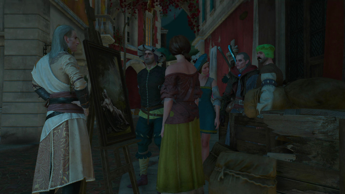 Geralt walking through the streets of Novigrad, wondering how safe he is travelling with Avallac'h, while Avallac'h teleports the clothes off the women in the market square.