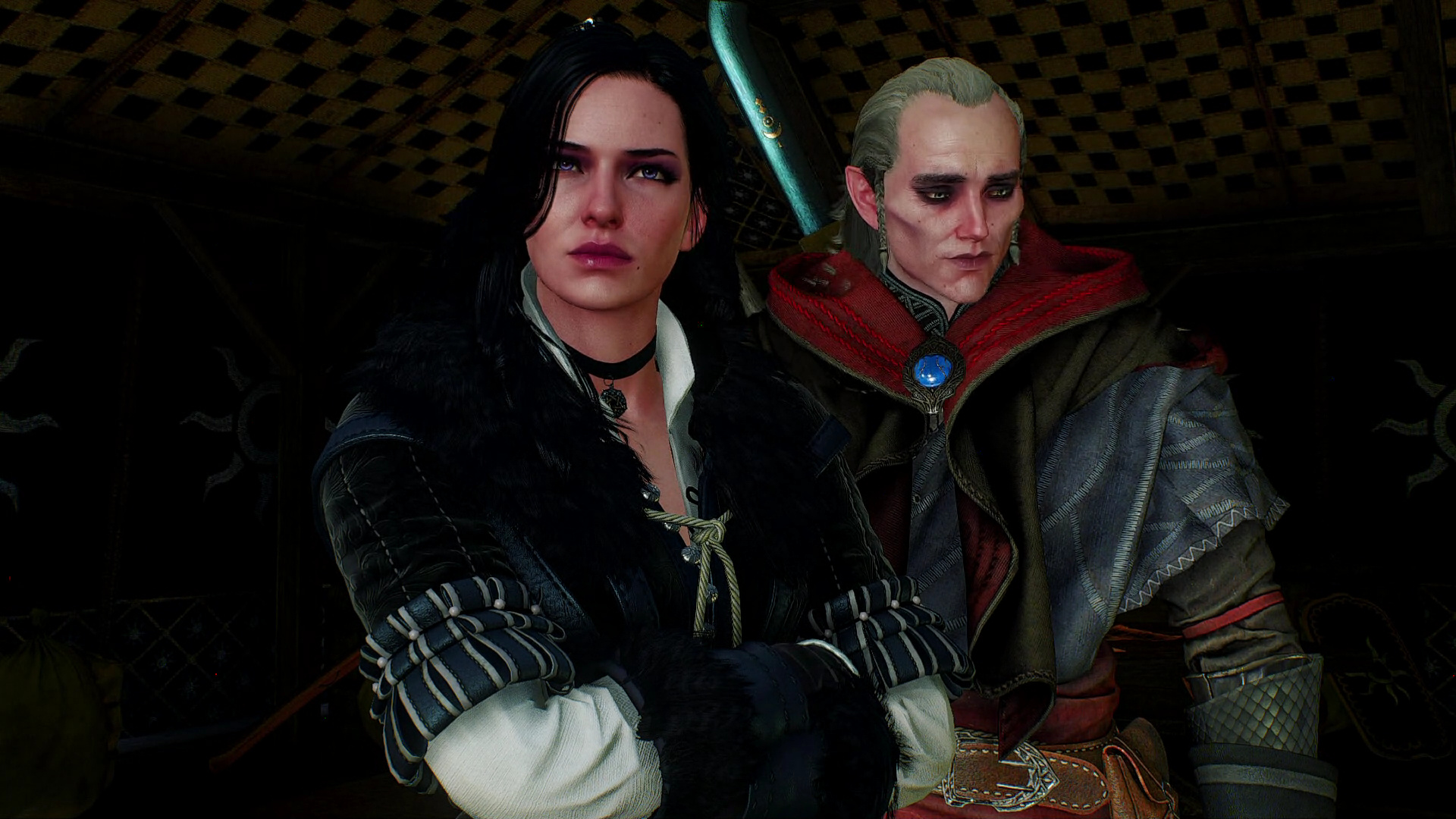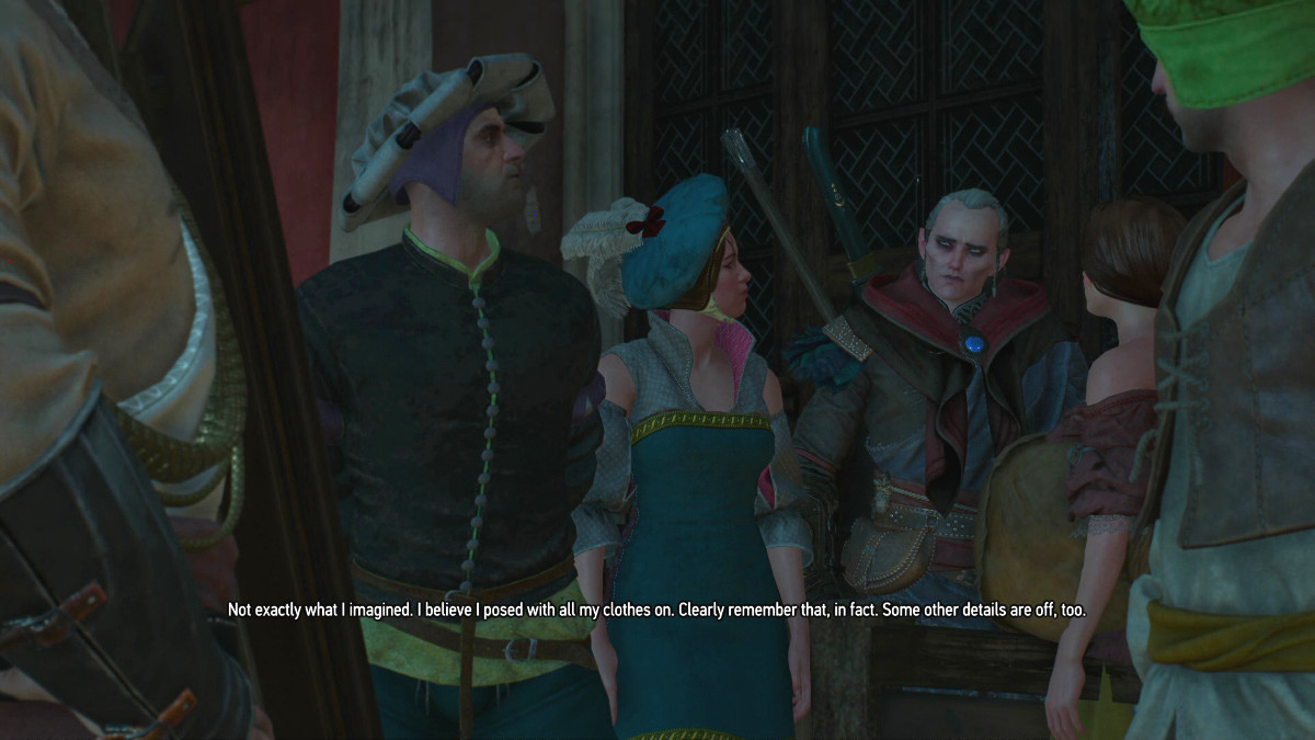 Avallac'h's mistress Tulip, hiding behind Avallac'h, while Geralt wishes he was standing anywhere other then between Avallac'h's girlfriend Ciri and Avallac'h's wife Isilira.