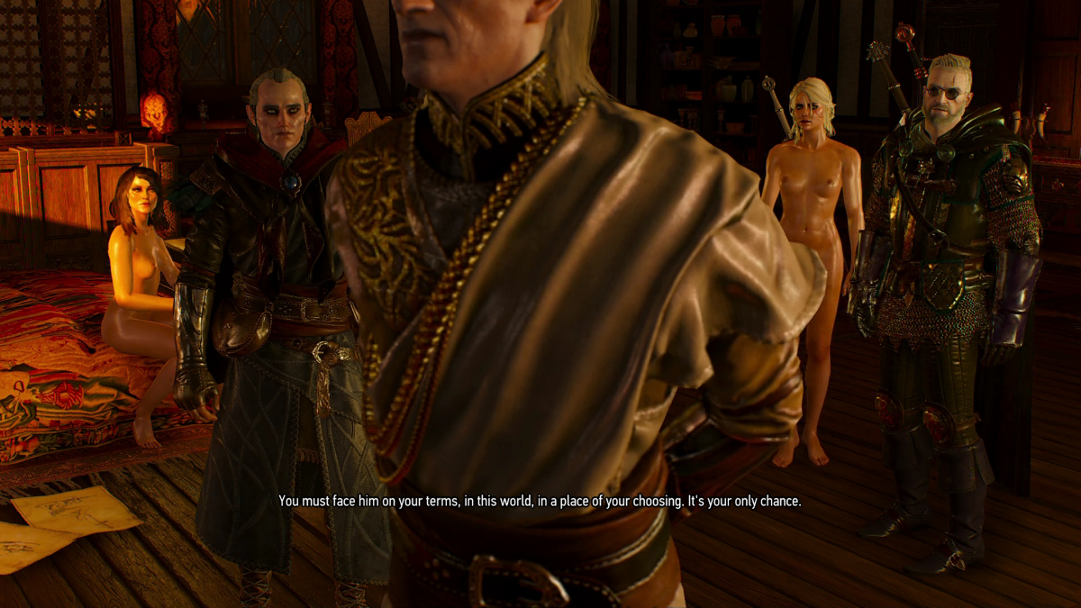 Lore-friendly Avallac'h traveling with his "gilded women", as they are described in the novel Lady of the Lake; the evil Elven sorcerer Avallac'h, his imprisoned slave unicorn, his prisoner Ciri (as seen in the novel: topless, wearing a skirt, and with long grey hair, instead of wearing battle gear and having short white hair as seen in the game), his 2 prostitutes Isilira and Amrynn, and his 3 unnamed crossbow carrying she-elf bodyguards. This scene was recreated from the description found in Chapter 5 of the novel.(You can watch my full 700+ episode Completion Run of Witcher 3 Wild Hunt here: https://www.youtube.com/playlist?list=PLKDjOx2XoGklkhYgEPCW3wGPAHA3xAYiF videos are uploaded daily, at the time of this writing, 104 episodes have gone up. They will continue to be uploaded daily until all 700+ episodes are there. I am still playing this, so no clue how many episodes it will eventually reach. The episodes are vanilla until 137, at which point I started adding Nexus mods. As of right now we are playing the game with 52 mods on it. The 4th run of the game is even more heavily modded then the first 3 runs... starting with episode 397, I modded the game to be lore-friendly to the novels Tower of Swallows and Lady of the Lake...and removed Geralt from the game, replacing him with Avallac'h, manually spawning in a lore-friendly Ciri and also all 5 of Avallac'h "gilded women" who traveled with him and Ciri in the novels, but are not seen in the vanilla version of the game)