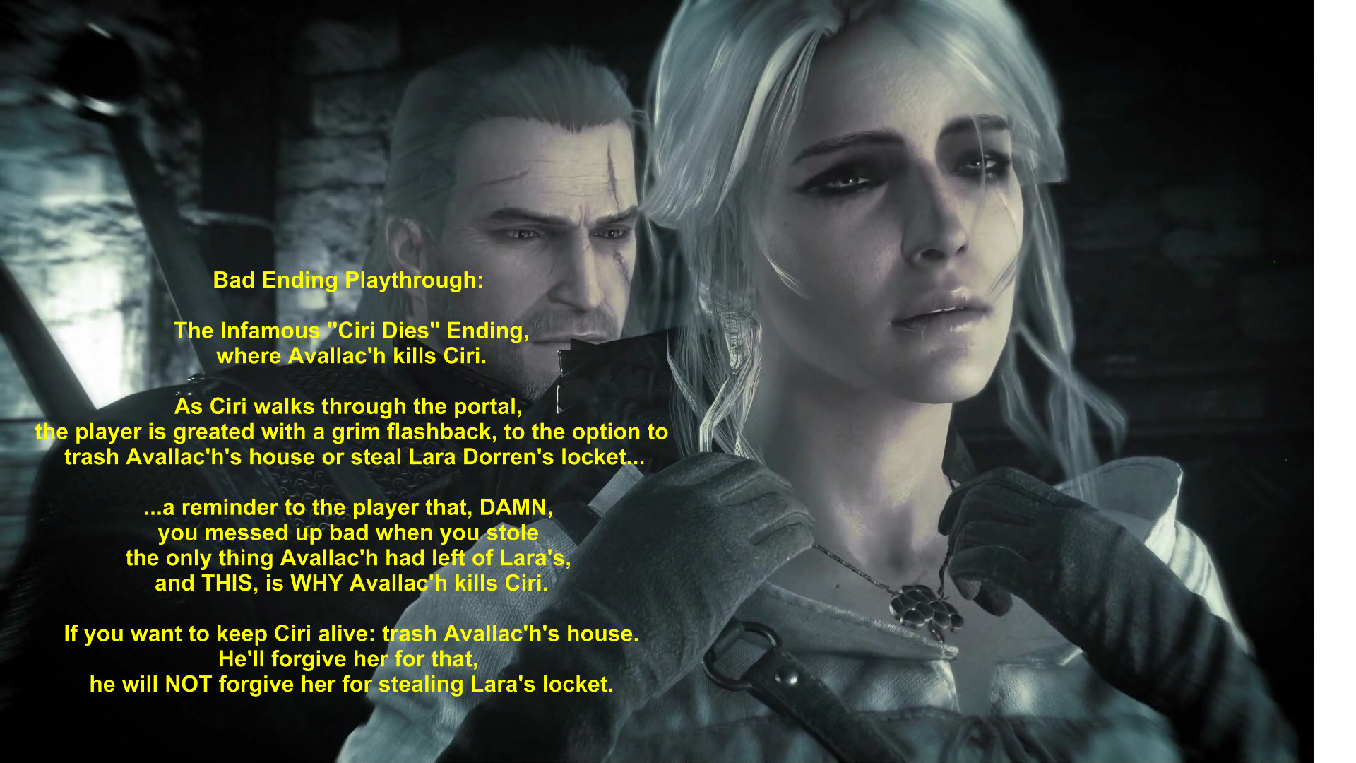 Avallac'h is one the game's 3 final boss battle villains and thus is also the character who murders Ciri if you play the game in such a way that you piss him off enough... and I will take you through step by step, either how to avoid or trigger the Ciri Dead Ending, depending on which way you want to play the game, as I've played the game enough times now to have gotten all the endings and know how to activate each one.