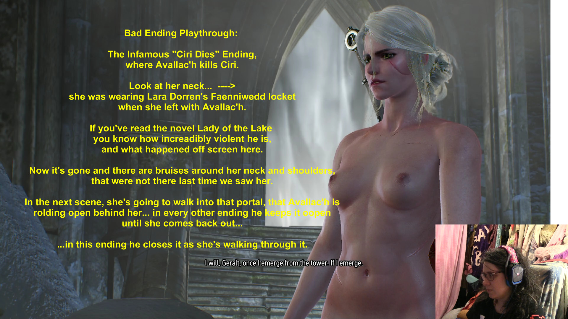 That is the rape scene in full, and that is why the average Wicher fan, hates Avallac'h. And, I've said it before, and I'll say it again... I do not see why people hate him. Ciri's a bitch. Ciri is violent. Ciri is abusive. And Ciri is a rapist. And yet people adore her as a "strong woman". No. A woman who beats up her boyfriend at every turn, is just as much of a scumbag as a man who beats up his girlfriend at every turn. Like I said, Avallac'h doesn't deserve the hate he gets from Witcher fans, any more then Ciri deserves the love she gets from them.