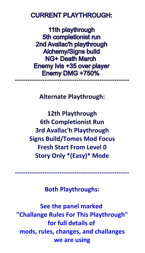 This current playthrough is largely a lot of test runs of hundreds of mods. It is being played open world with quests rarely happening, to allow us to run tests of various mods as I build them.